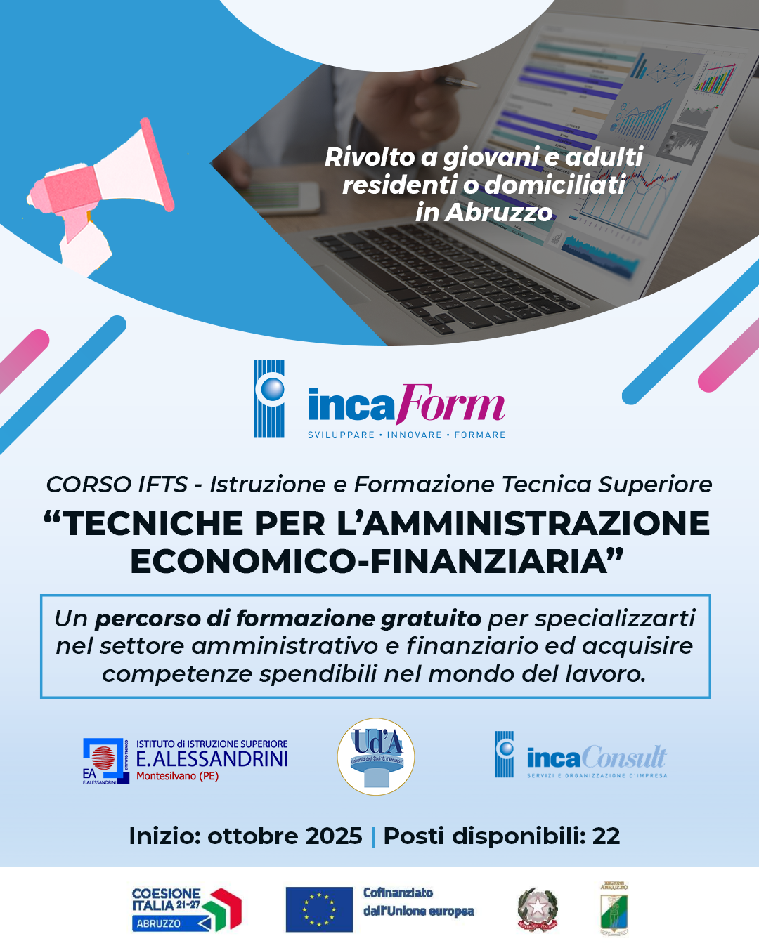 INCAFORM S.r.l., Ente di Formazione accreditato dalla Regione Abruzzo, promuove un percorso gratuito di Specializzazione IFTS (Istruzione e Formazione Tecnica Superiore) nell’ambito dell’amministrazione economico-finanziaria, destinato a 22 partecipanti.